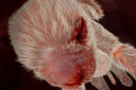 Sein Haarkleid ist noch schütter, die endgültige Pigmentierung ist jedoch schon fertig. Die Ohrmuscheln sind fertig ausgeprägt und auch das typische Merkmale – wie hier das Faltengesicht des Mastiffs – sind lange vor der Geburt zu erkennen. Die Föten hecheln bereits im Mutterleib, dadurch schützen sie sich schon vor der Geburt vor Überhitzung, da ihnen die Schweißdrüsen fehlen.